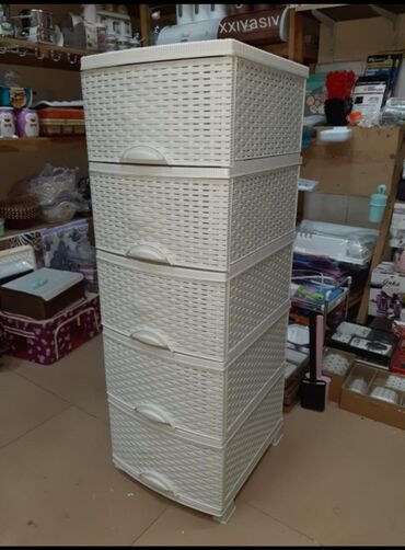 Plastik çekmecəli organizer – 5 bölməli - Material: möhkəm plastik, rattan toxumasını xatırladan dekorativ səth - Rəng: açıq krem/ağ - Quruluş: üst-üstə yığılmış 5 geniş çekməce, hər birində rahat...