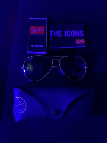 Ray-Ban markalı aviator tipli günəş eynəyi. Tündləşdirilmiş şüşələr günəş şüalarından qorunma təmin edir. Eynək nazik metal çərçivəyə malikdir. Dəstə qəhvəyi dəri eynək qabı, təmizləmə salfeti və s...