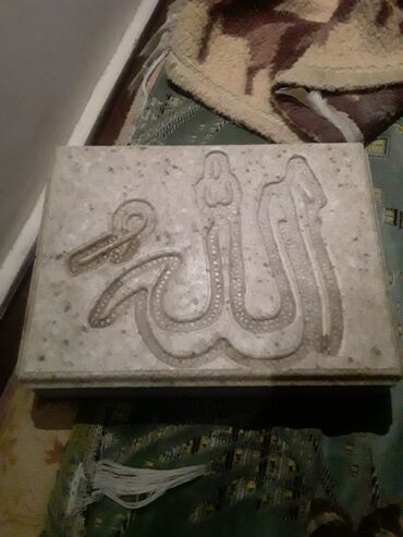 Mərmər dekor lövhə – üzərində ərəb qrafikasında “Allah” yazısı relyef oyma ilə işlənib. - Material: sıx strukturda, xırda nöqtəli teksturaya malik mərmər/daş kompozit. - Emal: dərin oyma, konturl...
