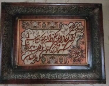 Zərif ornamental çərçivəsi və qızılımsı fon üzərində kalliqrafik yazıları ilə məkanlara ruhani və klassik estetik ab-hava qatır.