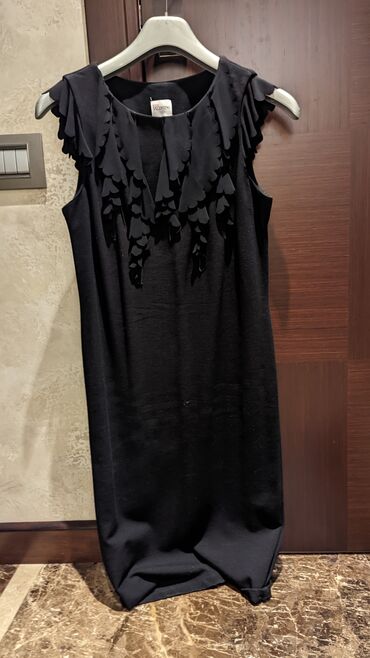 Qara məxmər ziyafət donu 1dəfə geyinilib - Model: çiyinlər açıq, V-formalı dekolte xətti - Parça: yumşaq, parıltısız məxmər - Qol: uzun, yüngülcə həcimli - Bel: parlaq daşlı kvadrat tokalı kəmər vu...