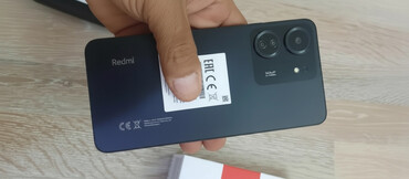 Arxa tərəfində ikili kamera moduluna malik qara rəngli "Redmi 13C" smartfonu. Cihazın arxasında barkod və məlumat lövhəsi var. Qutuda "Redmi 13C" adı və 6.74 düym (17.11 sm) displey ölçüsü qeyd olu...