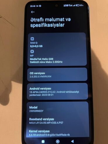 - Sistem: Android 15 (versiya: 15 AP3A.240905.015.A2), təhlükəsizlik yeniləməsi 2025-08-01