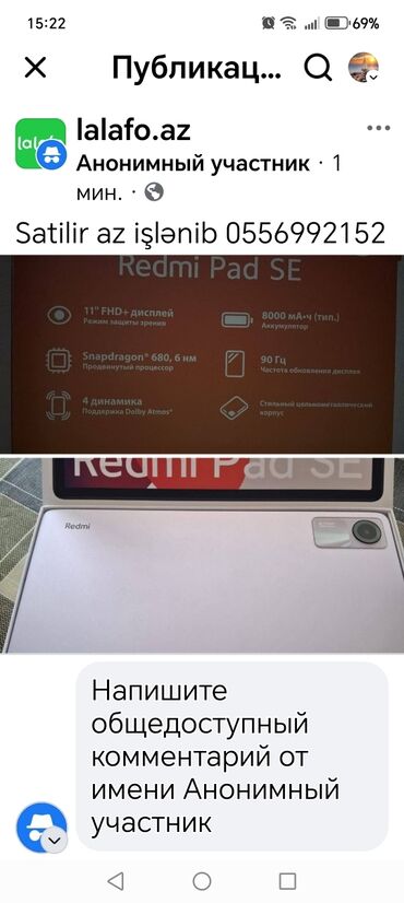Xiaomi- Redmi Pad Se. 256GB/8GB yaddas. 800mAh batareya, 8MP kamera. Heç bir problemi, cızığı yoxdur. Tam original. Əla vəziyyətdədir. Üzərində qutusu, original adapteri, ve 1 eded kabro verilir. 1...