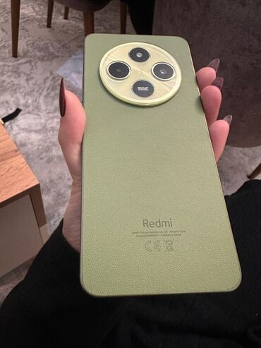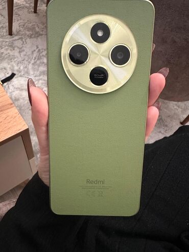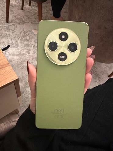 Redmi smartfon – yaşıl rəng, dəri teksturalı arxa panel və dairəvi kamera adası