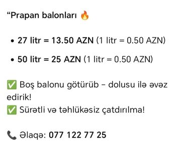 - Qiymətlər şəkildədəki kimi: 27 litr = 13.50 AZN (1 litr = 0.50 AZN), 50 litr = 25 AZN (1 litr = 0.50 AZN)