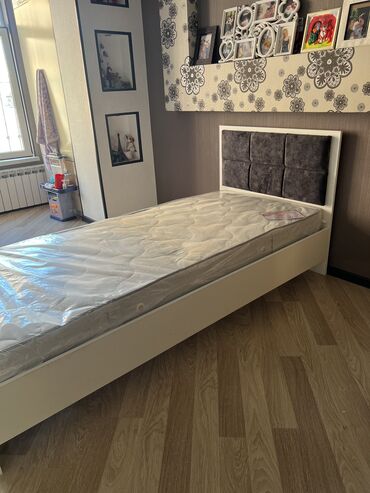 Ağ rəngli tək nəfərlik yataq, boz parça ilə bəzədilmiş başlığı var. Yatağın altında saxlama üçün geniş siyirmələr mövcuddur. Yataq otaqları və ya uşaq otaqları üçün praktiki seçimdir. Matras daxildir.