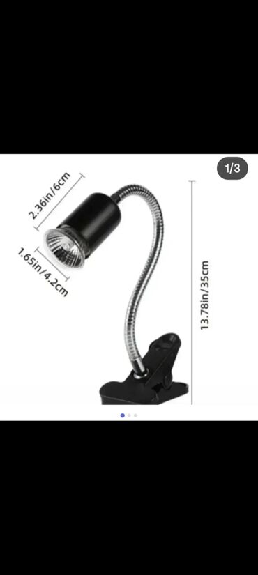 - Ölçülər (təqribən): lamp başlığı 6 sm uzunluq, 4.2 sm diametr; klipsli tutacağın ümumi hündürlüyü 35 sm.
