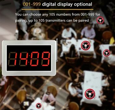 Masa cagri sifaris duymeleri, ofisiantlarin veya administrator ucun signal qebuldici qol saatlari veya merkezlesdirimis cagri qebuledici LCD monitorlarin satisi. Cagri sistemi 150-200m dek mesafede tutma gucu var, eger mesafe cox boyuk veya bir nece mertebeli yer olarsa xusui guclendirici antenler qurlasirirlir.
