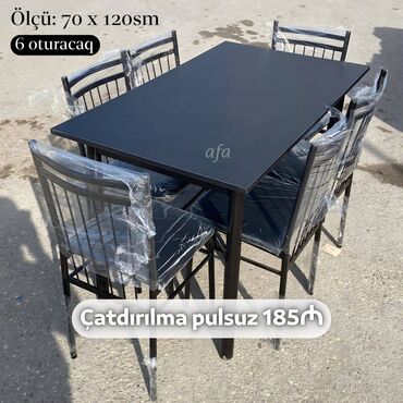 Restoran, kafe, bağ, mətbəx və s üçün masa destleri Masa + 6 Stul 215 azn Masa ölçü: 80x120 Masa+stullar açılıb yığılır Yeni və Hazır Çatdırılma şəhər daxili pulsuz Elani Screen Edib Watcapa Gonder...