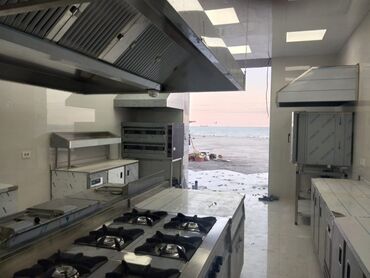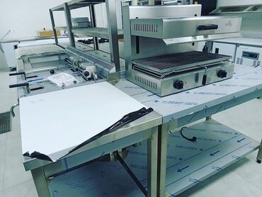 - Şəkillərdə: sənaye soyuducu/şaxtalı dolab, qazlı bişirmə plitələri və wok ocaqları, ızgara-salamander, havalandırma-kapelər, iş masaları və rəf sistemləri, istilik vitrini/ban-mari, altı rəfli hazırlıq masaları, soba modulları.