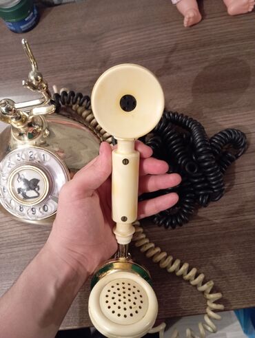 - Trubka: klassik iki tərəfli dinamik/mikrofon hissələri, krem rəngli bərk plastikdən; metal dayaqlı asqı qolu.