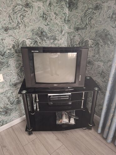- Televizor: klassik CRT (kineskop) “Multi System” yazılı ön panel, ön tərəfdə dinamiklər, kanal və səs düymələri, infraqırmızı pult qəbuledicisi. Yuxarıda oval şüşə qoruyucu panel.