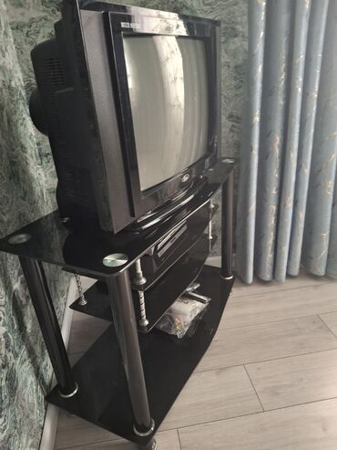 - Komplekt mebel: üçsəviyyəli, qara şüşə və metal dayaqlardan ibarət TV stendi. Üst rəf televizor üçün, orta rəf pleyer üçün, alt rəf aksesuar və disklər üçün uyğundur. Dairəvi metal bərkidicilər və dekorativ sütunlar.