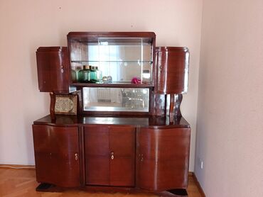 Detallar: stabil baza, yuvarlaq künclər, güzgülü arxa panel vitrində ekspozisiyanı vurğulayır. Retro interyer sevenlər və funksional saxlama mebeli axtaranlar üçün uyğun.
