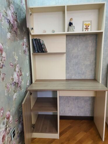 Kompyuter/iş masası – üst şkaflı model - Material: ağac teksturalı laminat və krem rəngli ön panellər - Ölçü (təxmini): geniş iş səthi; sağ-sol dayaqla sabit konstruksiya - İş səthi: rahat yazı və...