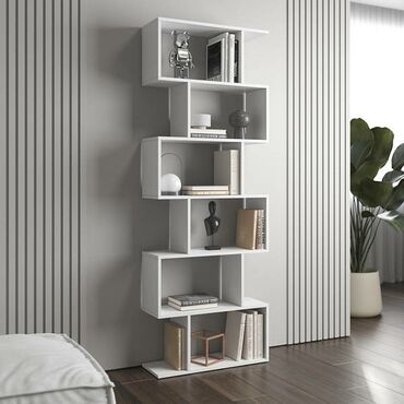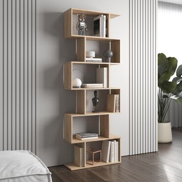 Divar rəfi – müasir dizayn - Material: ağac teksturalı laminat/LDSP - Rəng: təbii ağac tonu, açıq kənar bordürlə - Konfiqurasiya: pilləli kompozisiya; 6 açıq bölmə (dörd üfüqi, iki şaquli) - İstif...