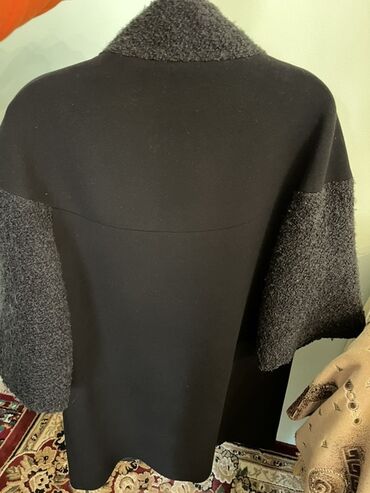 Qadınlar üçün qışlıq plaş/palto – qısa kəsimli ponço stili - Rəng: tünd boz - Material: qalın parça, yumşaq süni kürk detalları - Yaxası və qol ucları: qara süni kürk - Bağlanma: ön hissədə 4 düym...
