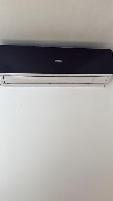 - RIF brendinin divar tipli split kondisioneri: daxili blok qara şüşə ön panellə, xarici blok RIF logolu.