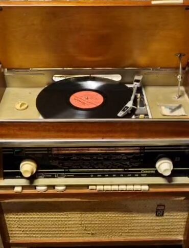 Sovet istehsalı retro radioqəbuledici və pikap kombini. - Korpus: taxta kabinet, yuxarıda mexaniki pikap (vinil üçün). - İdarəetmə: ön paneldə səs və tənzimləmə düymələri, dalğa diapazonu seçmək ü...