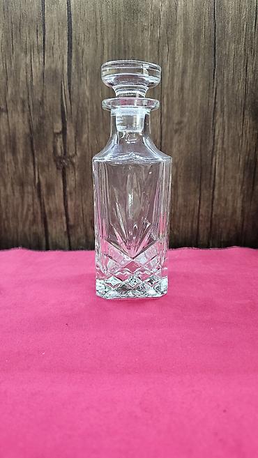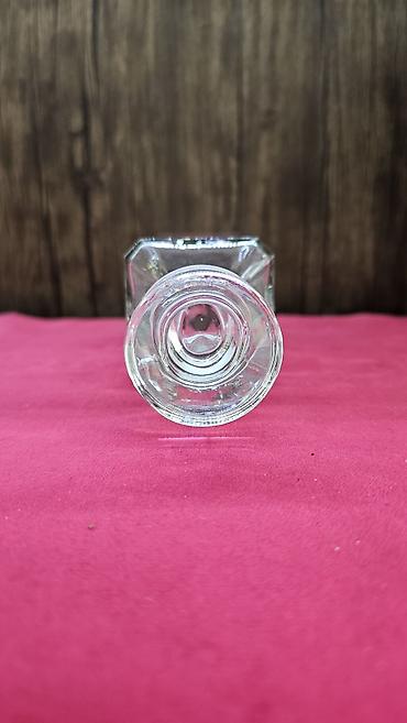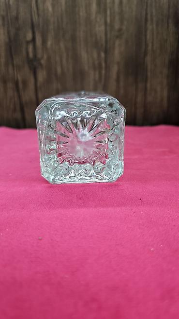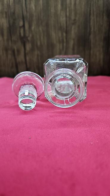 Şüşə qrafin - Material: şəffaf şüşə - Forma: kvadrat gövdə, yumşaq künclər; yuxarı hissədə geniş boğaz - Qapaq: eyni şüşədən hazırlanmış sıx oturan taxta formalı tıxac/qapaq - Həcm: təxminən kiçik...