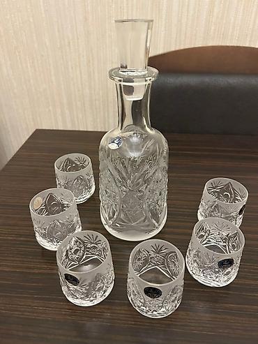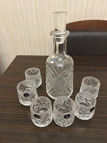 Büllur dekanter və qədəh dəsti - Komplekt: 1 ədəd qapaqlı dekanter + 5 ədəd ayaqlı qədəh - Material: buzlu (mat) şüşə/büllur - Dizayn: dekanter və qədəhlər üzərində oyma naxışlar, xırda parlaq daş...