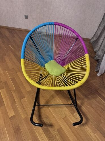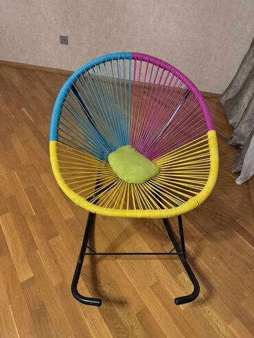 - Dizayn: dairəvi formalı, açıq hörgülü oturacaq; mavi, bənövşəyi, sarı və firuzə tonlarının kombinasiyası. Kiçik yaşıl baş/oturacaq yastığı daxildir.