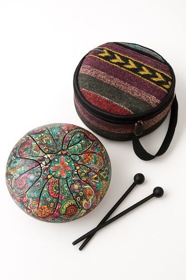 Rəngarəng naxışlarla bədii şəkildə boyanmış metal tongue drum (steel tongue drum) – meditasiyaya, sound-healing seanslarına, yoga və musiqi improvizasiyasına uyğun.