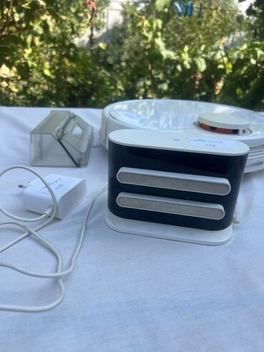 Ağ rəngli robot tozsoran və şarj stansiyası dəsti. Xüsusiyyətlər: - Dairəvi gövdə, üst hissədə LIDAR tipli qabarıq modul (otağın 3D xəritələnməsi və planlı təmizlik üçün). - Gövdə üzərində start/p...