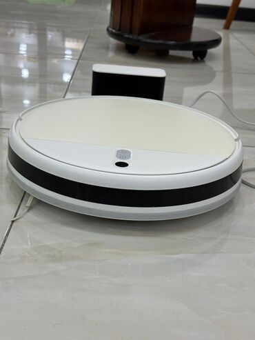 Ağıllı robot tozsoran – dairəvi dizayn, ağ korpus. Şarj stansiyası və şəbəkə kabeli komplektdədir.