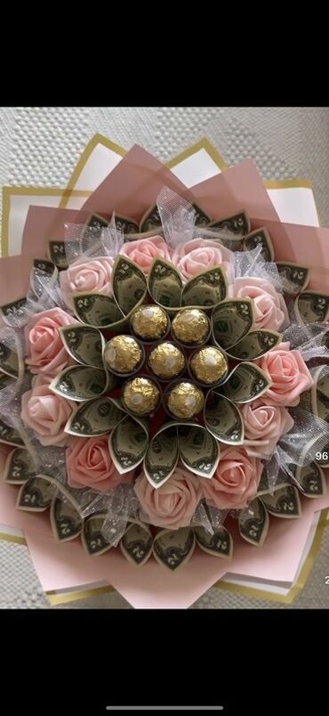 - Pul buketi dizaynı: bükülmüş dollar banknotları ilə petal effektli kompozisiya