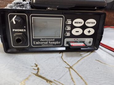 - Bağlantılar: MIDI OUT, müxtəlif idarəetmə düymələri, qulaqcıq üçün çıxış (sampler üzərində), fotoşəkillərdə görünən güc adapteri və kabellər.
