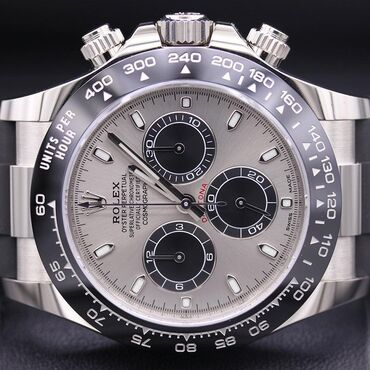 Rolex Cosmograph Daytona – Oyster Perpetual xronoqraf - Korpus: parlaq polad (Oystersteel), tək istiqamətli qara keramika “tachymeter” bezel (UNITS PER HOUR miqyaslı). - Siferblat: gümüşü sunburst...