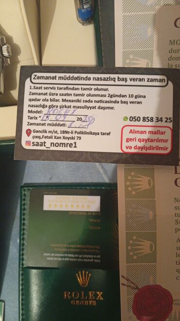 Rolex qol saatı – orijinal qutu və beynəlxalq zəmanət kartı ilə. Qiymət:150 manat Xüsusiyyətlər: - Korpus və qolbaq: metal (paslanmayan polad görünüşlü), klassik Rolex qatlanan kilid. - Siferblat: ...