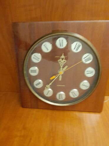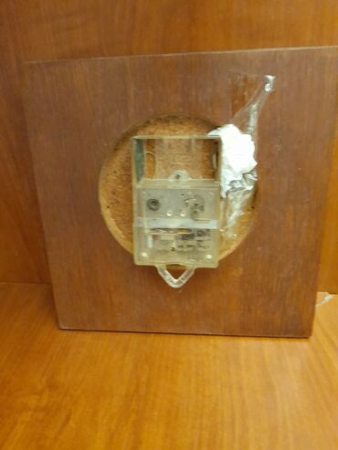Divar saatı (retro dizayn) - Korpus: cilalanmış ağac panel, kvadrat forma - Siferblat: dairəvi, şüşə örtüklü; taxta fakturalı fonda “Made in USSR” yazısı - Rəqəmlə