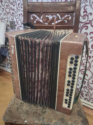 Akkordeon – klavişli və bas düyməli - Tip: Klavişli akkordeon (piano klaviaturası) və sağ tərəfdə bas/akord düymələri - Korpus: Qəhvəyi-mərmər fakturalı örtük, metal yan qapaqlar, klassik keçə kör...