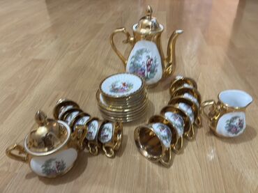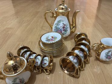- Dizayn: ağ porselen üzərində romantik səhnələr, qızılı kənarlar və qızılı daxili səthli fincanlar