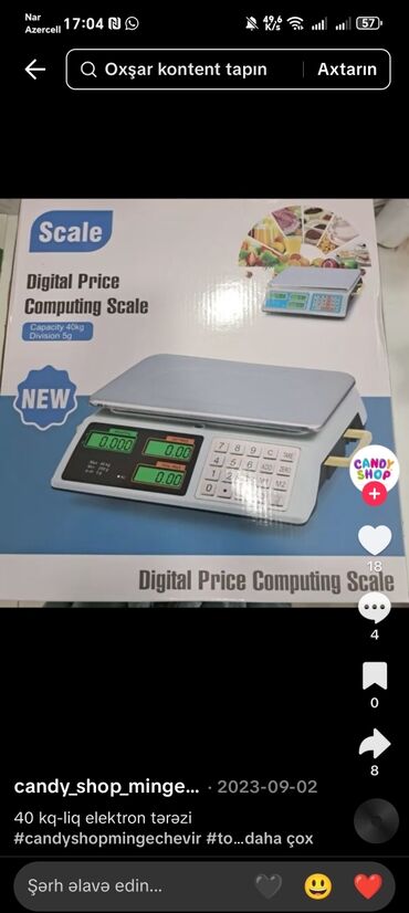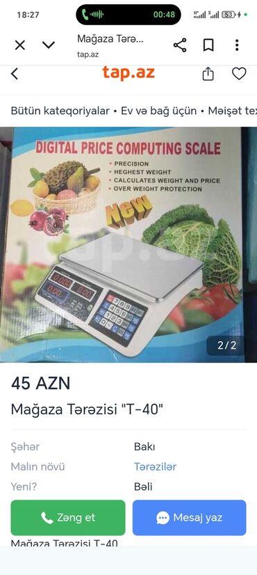 Qutudakı məlumat: Digital Price Computing Scale, Capacity 40 kg, Division 5 g; “Mağaza Tərəzisi T-40”.