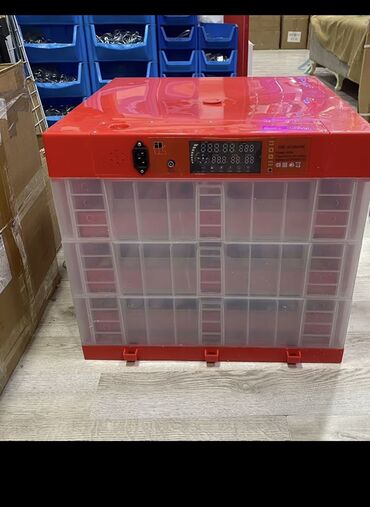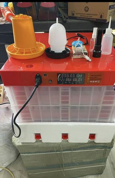 Elektriklə işləyən rəqəmsal yumurta inkubatoru. Korpusun üst hissəsi qırmızı, şəffaf çoxbölməli kamera ilə. Ön paneldə LED ekran və idarəetmə düymələri var: temperatur və rütubət göstəriciləri, ventilyator göstəricisi, yumurtaların çevrilməsi üçün idarəetmə. Yan hissədə standart AC güc girişi və açarı mövcuddur.