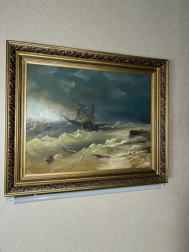 3) Dəniz mənzərəsi: fırtınalı dalğalar, üfüqdə qaranlıq buludlar, yelkənli gəmi.