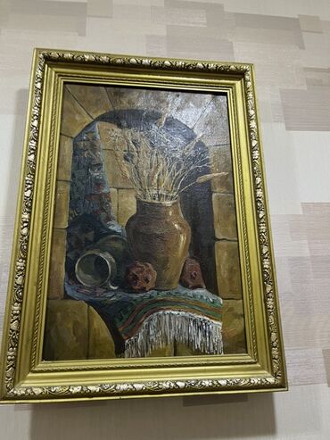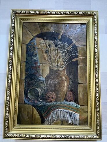 1) Natürmort: daş tağ fonunda saxsı küp, quru çiçəklər, qədim qablar və naxışlı örtü.