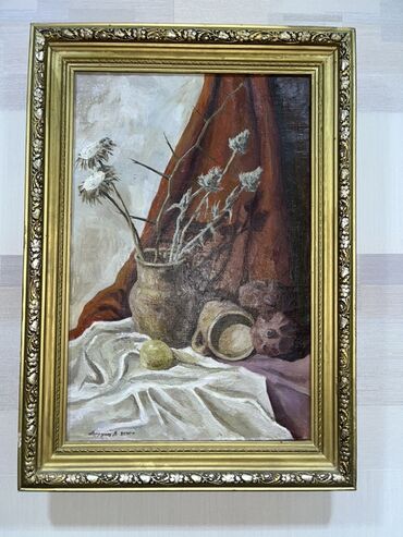 4) Natürmort: ağ örtü üzərində saxsı qablar, küp, quru çiçəklər və meyvə; fonunda qırmızı parça. Aşağı küncdə “2000” tarixli imza görünür.