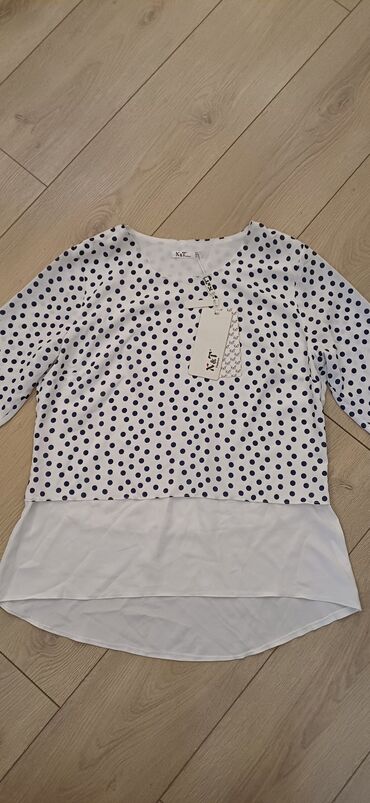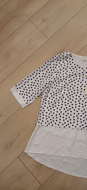 Qara-ağ xallı qadın bluzası - Rəng və naxış: Ağ fon üzərində xırda qara xallar (polka-dot). - Yaxa: Yumru, yüngül büzgülü ön hissə. - Qol: 3/4 uzunluqda, yüngül həcimli rezinli/plisse effektli qol...