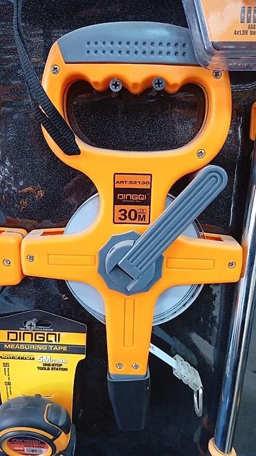 Qutuda: DINGQI 30 m uzun polad ölçü lenti (ART.52130) və istifadə üçün hazır kranklı mexanizm.