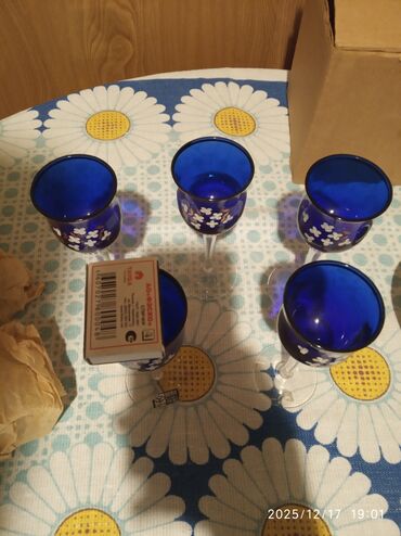 6 ədəd Bohemia kristal qədəh dəsti - Material: Bohemia kristalı (stiker üzərində “Crystal” işarəsi). - Rəng və dizayn: Mat mavi fon, əl işi görünüşlü ağ çiçək naxışı və qızılı bəzəklər; şüşə üzəri...