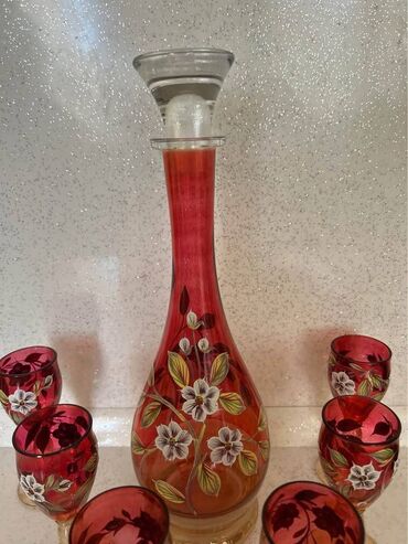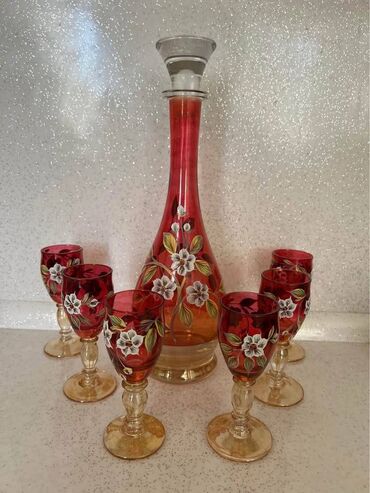 Kristal qrafin və 6 stəkanlıq likör dəsti - Material: yüksək keyfiyyətli kəsimli kristal - Komplekt: 1 qrafin + 6 ayaqlı kiçik stəkan - Dizayn: üst kənarlarda qızılı işləmə, əl boyaması çiçək moti...
