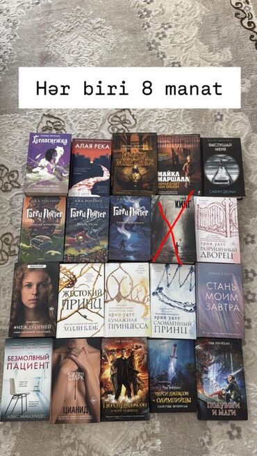 - Hər biri 7 manat: “Kаменная пациентка”, “Перси Джексон” seriyasından hissələr, “Тень и кость”, Mayk Omer “Заживо в темноте”, John Marrs “Code”, Bernard Werber “Ящик Пандоры” və s. (şəkildə X işarəli olanlar mövcud deyil).