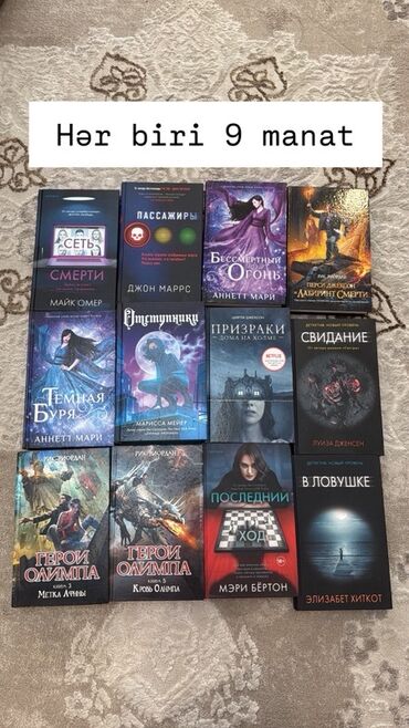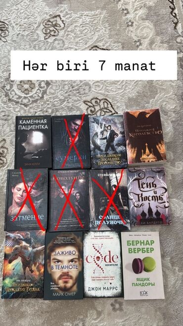- Hər biri 7 manat: “Pyerşi Cekson” seriyasından “Sonuncu peyğəmbərlik”, “Tritanın lənəti”, Stefanı Mayerdən “Zatmeniye”, “Revolyutsiya”, “Sançe v polunoç”, Li Barduqo “Ten i kost”, Mayk Ömer “Jajivo v temnote”, Con Marrs “Code. Nositeli”, Bernar Verber “Yaşçik Pandorı” və b. Qırmızı X-lər satılıb.