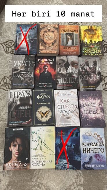 - Hər biri 5 manat: Stiven Kinqdən bir neçə roman və hekayələr toplusu, Aqata Kristi seriyasından klassik detektivlər (Bexləhəmski, Tragediya üç pərdədə, Qonçaq Smerţi), H. Lovkraft seçmələr, Çak Palanik “Proklyatıyə”, Nil Qeyman hekayələr toplusu, Aleks Mixailides “Devlər”, Sara Cio “Sərgüzəştli gecə”, Mayk Ömer “Vnutri ubiitsy” və s. Şəkildə qırmızı X ilə işarələnənlər mövcud deyil.