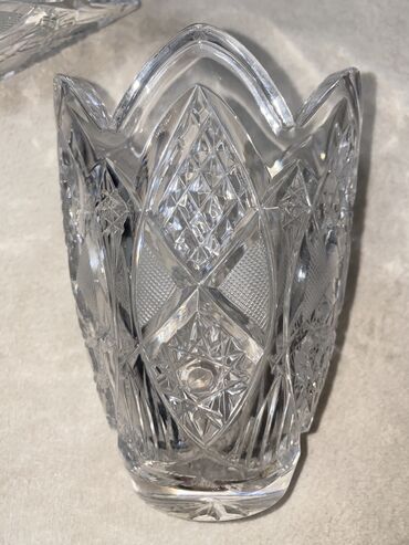 Məhsul: Kəsimli büllur vazalar (2 ədəd) - Material: qalın, şəffaf büllur - Dizayn: əl işi üslubunda kəsimlər – romb şəbəkə, ulduz və çiçək motivləri, parıltını gücləndirən çoxüzlü relyef - Forma: ...